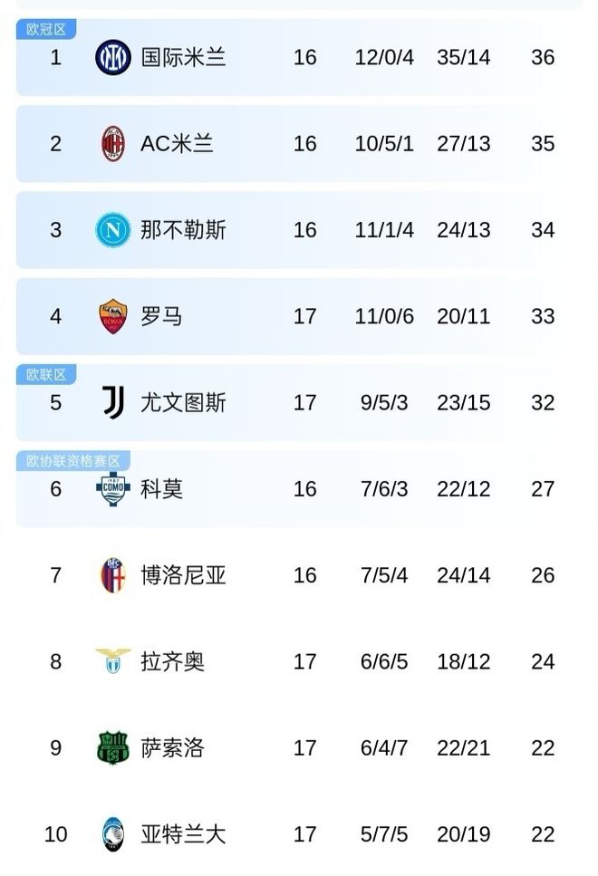 而卫冕冠军那不勒斯34分屈居第3位,罗马和尤文分别积33分和32分,排名第4和第5位,尤文则领先身后的第6名科莫队多达5分。
