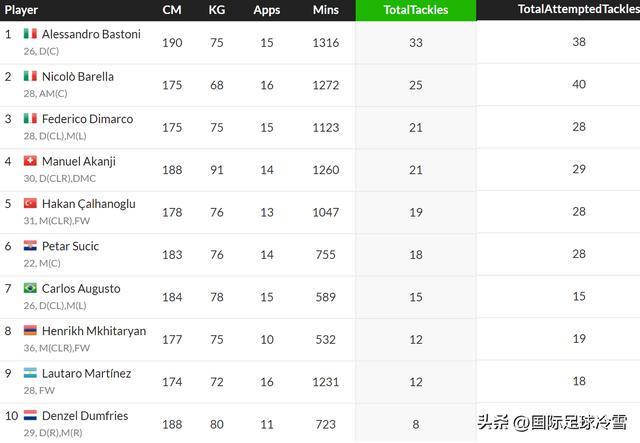 同时,巴斯托尼还是国米的“抢断王”——他38次尝试抢断,33次成功,以较大优势领先第二名(巴雷拉25次成功)。